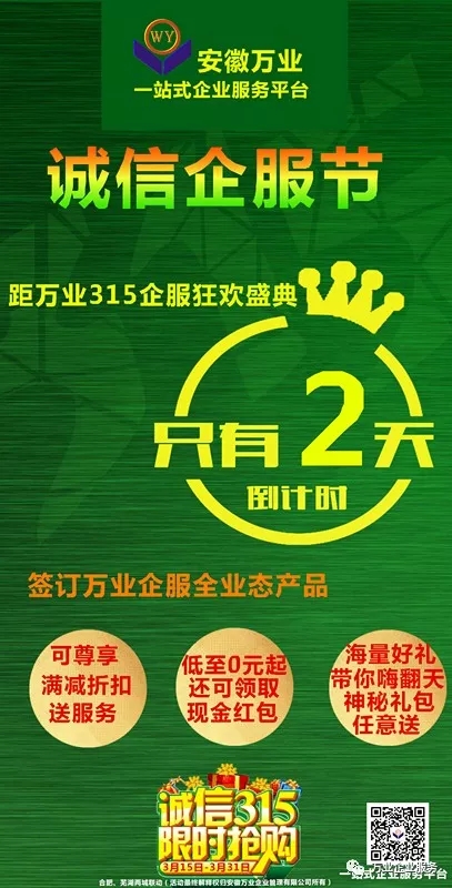 315來(lái)源 315即國(guó)際消費(fèi)者權(quán)益日,定于每年的3月15日,因?yàn)樵?962年的3月15日時(shí)任美國(guó)總統(tǒng)的約翰·肯尼迪在美國(guó)國(guó)會(huì)發(fā)表《關(guān)于保護(hù)消費(fèi)者利益的總統(tǒng)特別咨文》一文,文中首次提出了著名的消費(fèi)者四項(xiàng)權(quán)利。最早由國(guó)際消費(fèi)者聯(lián)盟組織于1983年確定,目的在于擴(kuò)大消費(fèi)者權(quán)益保護(hù)的宣傳,使之在世界范圍內(nèi)得到重視,促進(jìn)各國(guó)和地區(qū)消費(fèi)者組織之間的合作與交往,在國(guó)際范圍內(nèi)更好地保護(hù)消費(fèi)者權(quán)益。 現(xiàn)為了響應(yīng)315誠(chéng)信服務(wù)消費(fèi)者的號(hào)召,安徽萬(wàn)業(yè)特推出315企服節(jié)盛典活動(dòng)。 距315企服節(jié)盛典還有2天 誠(chéng)信企服節(jié) 即將到來(lái)! 重磅驚喜 萬(wàn)業(yè)公司“3.15誠(chéng)信企服節(jié)”重磅推出:刻章0元,代賬即返現(xiàn),商標(biāo)8折,資質(zhì)送3A,萬(wàn)元神秘大禮+抽獎(jiǎng)活動(dòng)! 驚喜不 安徽萬(wàn)業(yè)315企服節(jié)盛典即將到來(lái),活動(dòng)中驚喜不斷!您還在等什么?合肥、蕪湖兩城聯(lián)動(dòng),嗨翻購(gòu)! 企業(yè)一站式服務(wù)平臺(tái) 工商注冊(cè)、財(cái)稅代賬、審計(jì)評(píng)估、財(cái)務(wù)咨詢、商標(biāo)專利、資質(zhì)審批、人才獵頭、人才報(bào)名、金融保險(xiǎn)、信用評(píng)級(jí)、法務(wù)咨詢、項(xiàng)目申報(bào) 公司網(wǎng)站:m.hv15.cn 聯(lián)系方式:400-0551-976 合肥總部:安徽省合肥市南一環(huán)與馬鞍山路交口恒興廣場(chǎng)A座24樓 分部:合肥市行政服務(wù)中心一樓“萬(wàn)業(yè)公司代理窗口”(工商局窗口正對(duì)面) 分部:合肥市瑤海區(qū)行政服務(wù)中心一樓“萬(wàn)業(yè)公司代理窗口”(工商局窗口正對(duì)面) 蕪湖分部:蕪湖市鏡湖區(qū)偉星時(shí)代金融中心610室 (申經(jīng)理:189-0560-8966)
