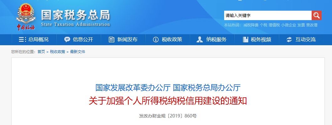 近日,國家稅務總局發布《國家發展改革委辦公廳 國家稅務總局辦公廳 關于加強個人所得稅納稅信用建設的通知》。